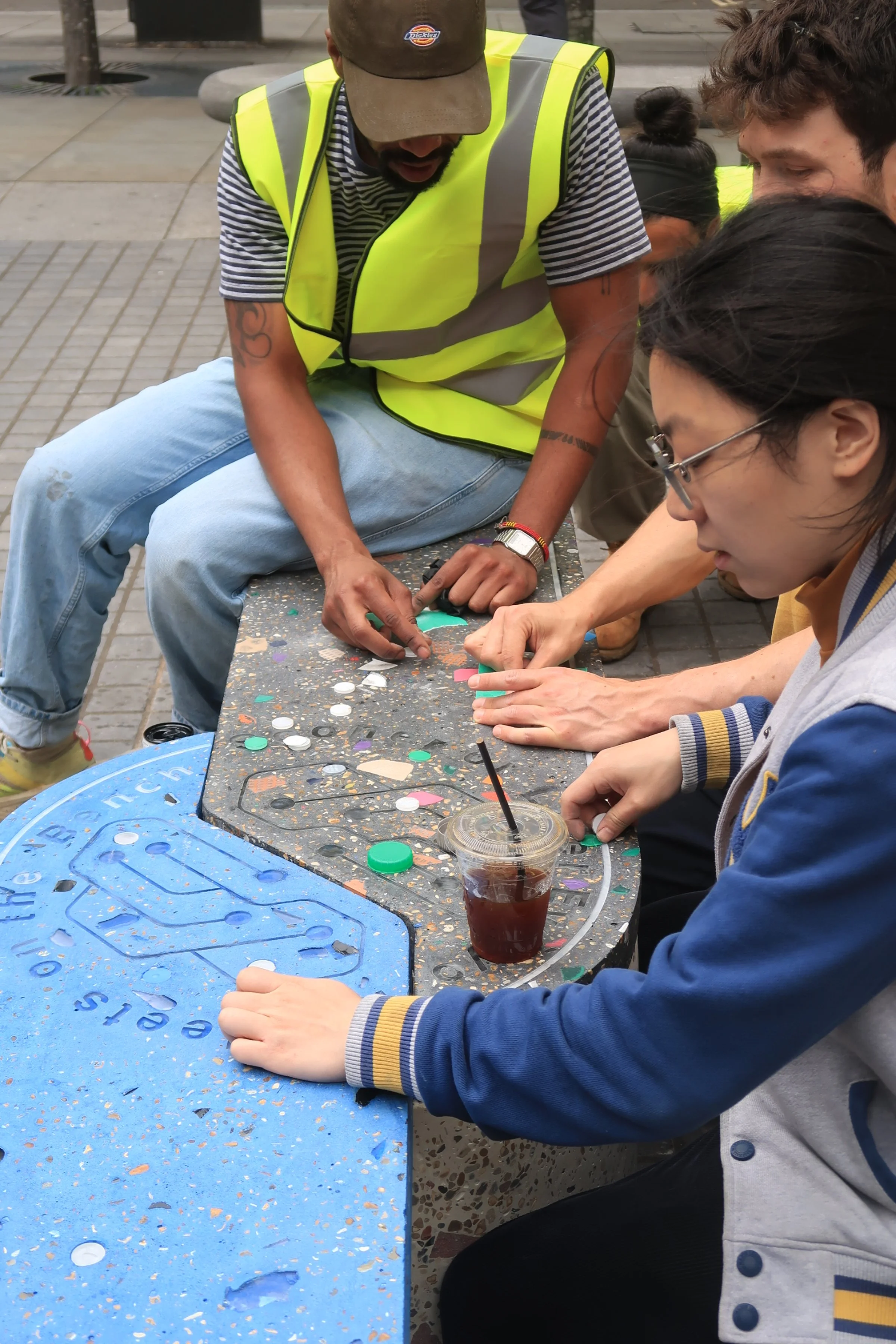 The bench explores tension and unity through form: rigid squares—cast from recycled glass, reclaimed plastic, and concrete—interlock and evolve into a circular platform. This interplay symbolises diversity and dialogue, echoing Fitzrovia’s creative and bohemian legacy. Each material used in The Junction tells part of the Fitzrovia story; recycled glass evokes its creative energy, reclaimed construction waste nods to its industrial past, and recycled plastic represents the everyday lives and voices of its residents.